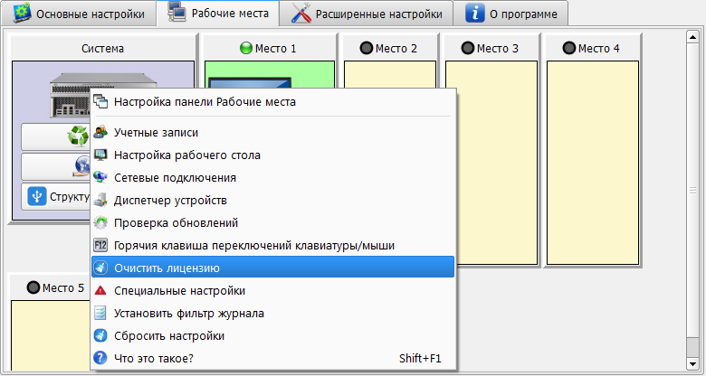 Кнопка очистка лицензии дублируется в контекстном меню изображения системного блока во вкладке «Рабочие места»: