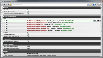 Итак, давайте продолжим отслеживать путь дропа с момента убийства нашего бандита. Игра выбрала дроп какого-то предмета из набора Pool_GunsAndGear, нам выпал билетик «Оружие» в лотерее. Далее мы оказываемся в наборе Pool_Weapons_All, который выглядит так: